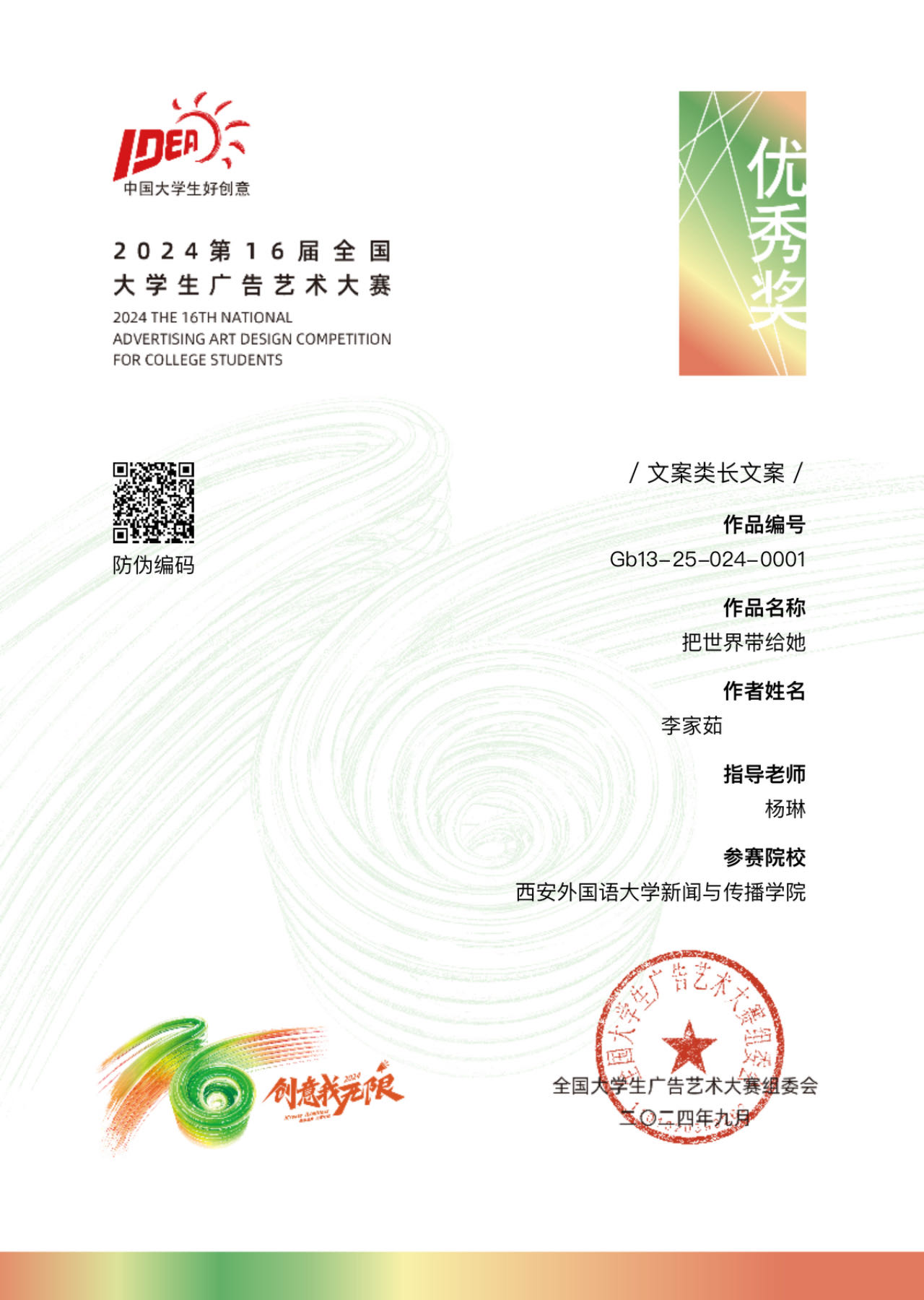 9月6日,2024第16届全国大学生广告艺术大赛全国总评奖项公布,我院共计14组作品获得陕西赛区奖项,其中2组作品荣获全国优秀奖。这是我院在历次全国大学生广告艺术大赛中获得省级以上奖项数量最多、获奖比例最高、获奖作品赛道覆盖最为广泛的一次。 其中,由杨琳老师指导,李家茹同学创作的长文案作品《把世界带给她》,以及由赵桐羽老师指导,蔡宇菲、肖紫茹、樊凡、马玉梅创作的微电影广告作品《HBN,焕发自信,......